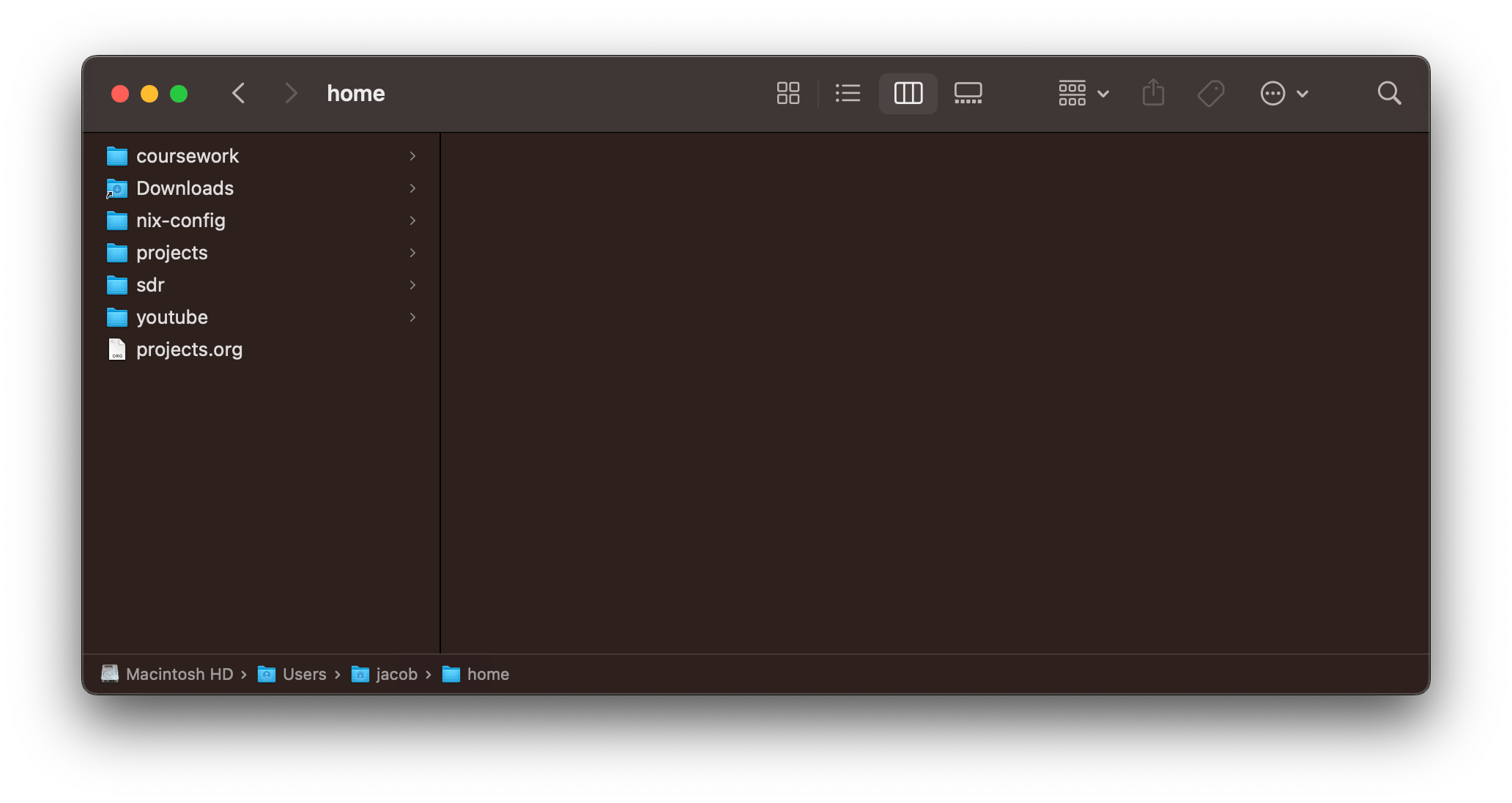 , has allowed me to create an extremely clean, reproducible, and comprehensible system — I know what’s on my machine and can manage it appropriately. I don’t need to see the cluttered mess of dotfiles because they are all consolidated in my Nix configuration, and whatever applications want to throw in my home folder, so be it.